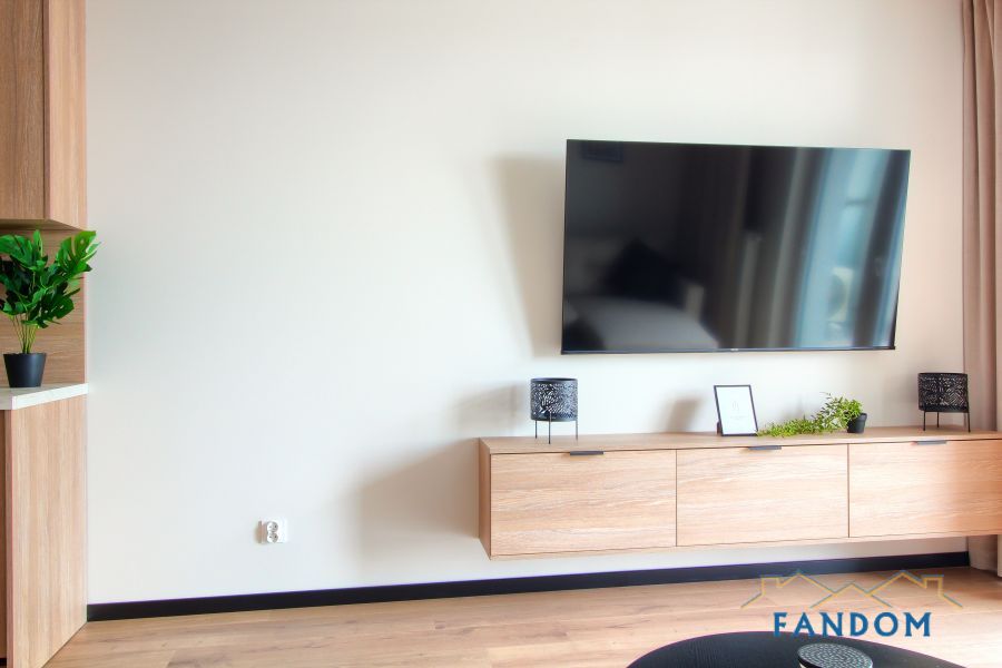 Przestronny salon z kuchnią wyposażony w wysokiej jakości meble, wygodną sofę i duży telewizor.