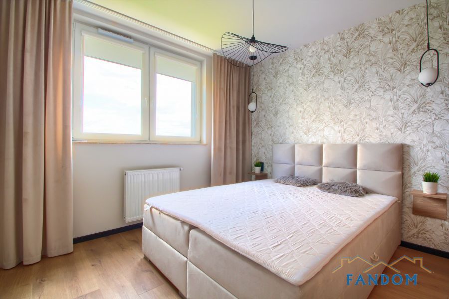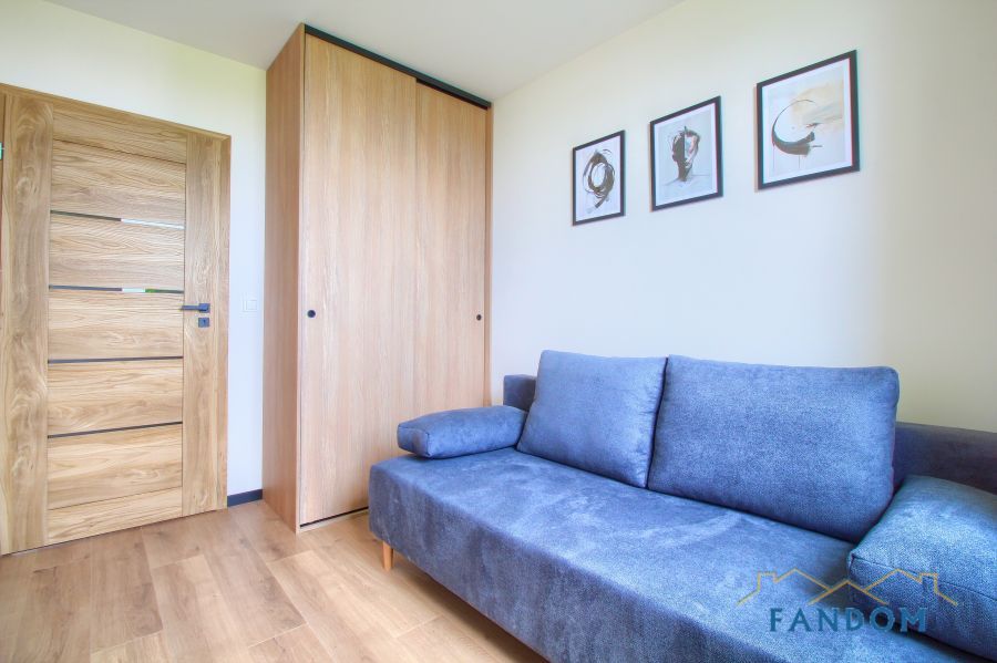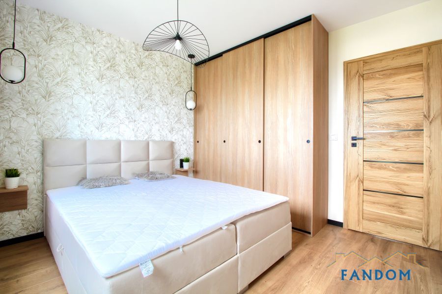 W sypialni wygodne łóżko dla pary, obszerna szafa. W pokoju znajduje się szafa w zabudowie, rozkładana sofa.