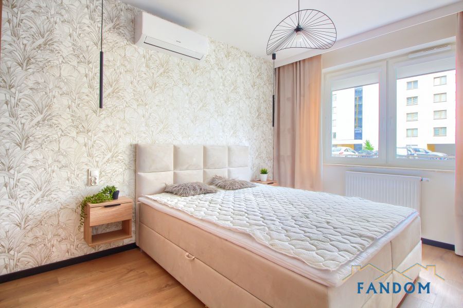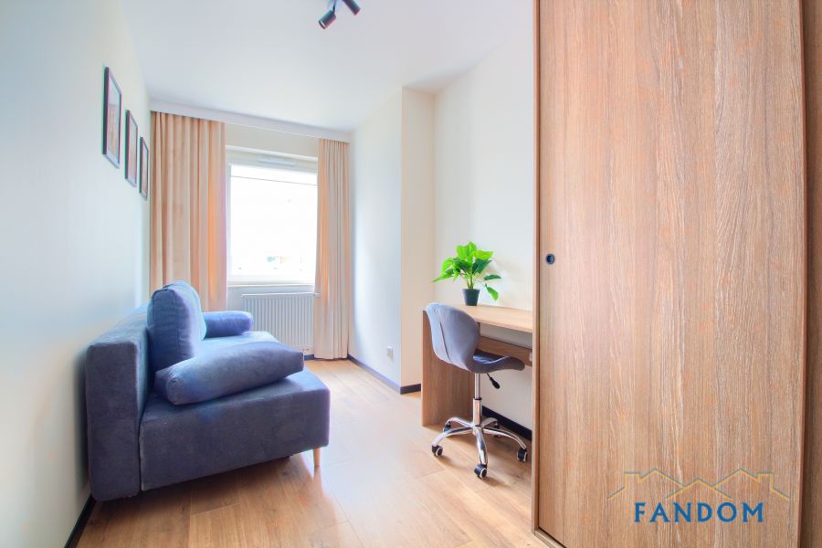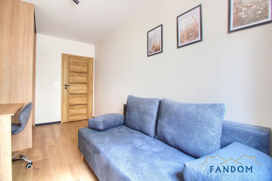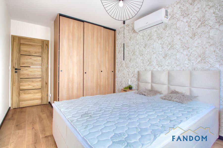 W sypialni wygodne łóżko dla pary, obszerna szafa. W pokoju znajduje się szafa w zabudowie, rozkładana sofa.