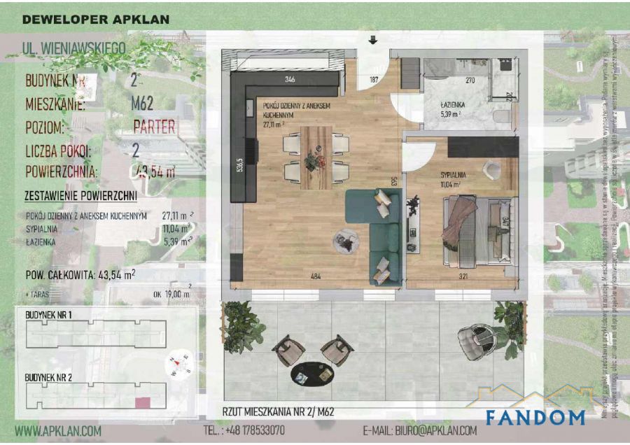 Mieszkanie o powierzchni 43,19m2, zlokalizowane na parterze bloku przy ulicy Wieniawskiego.