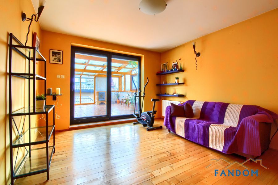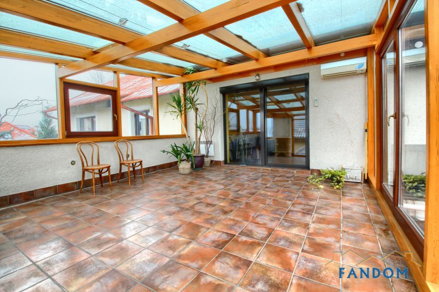 Na piętrze dwie sypialnie, łazienka, salon i ogromny ogród zimowy.