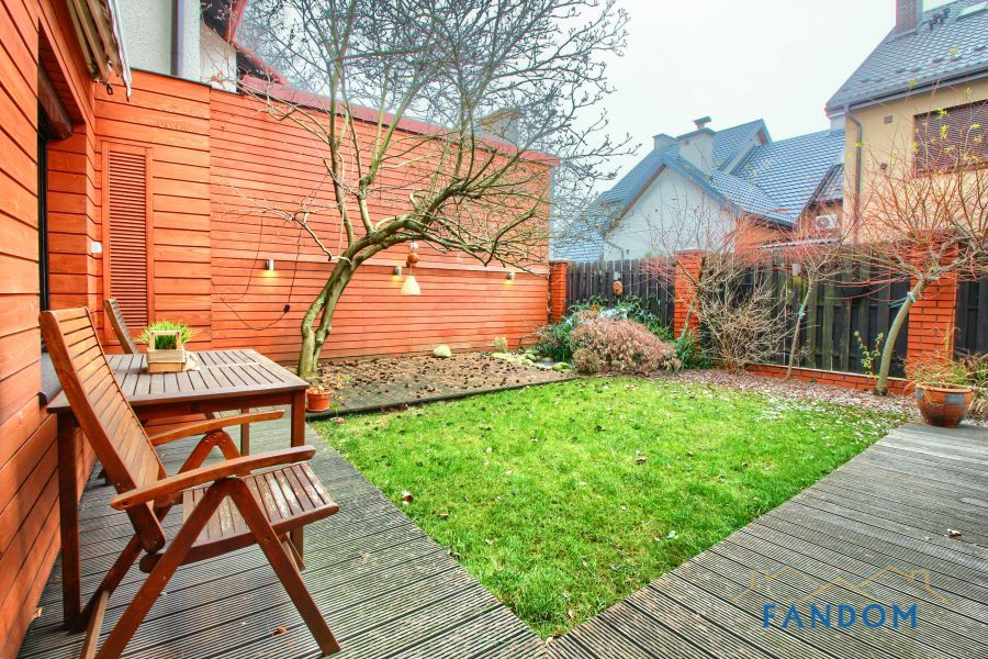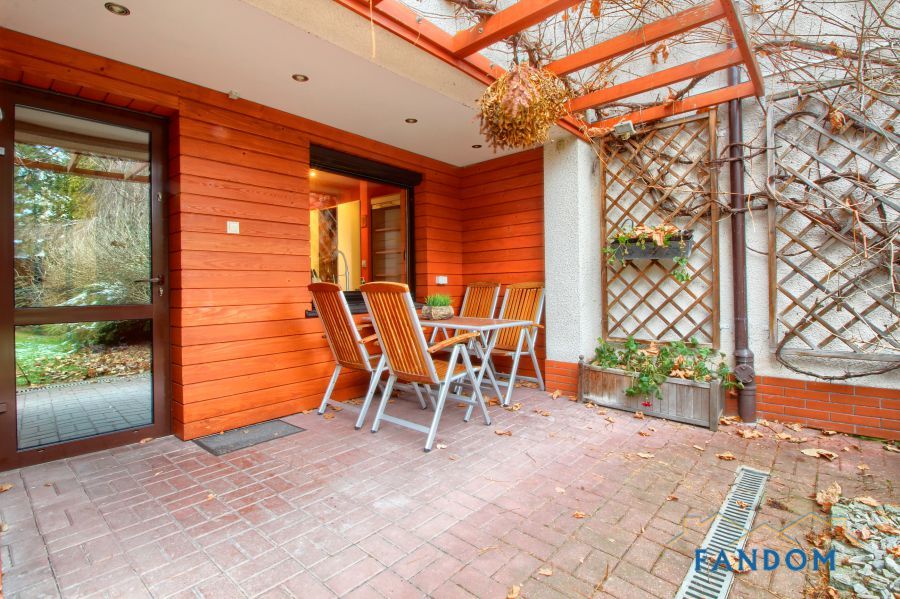 Na parterze salon połączony z kuchnią, pokój - gabinet i łazienka. Z salonu wyjście na kameralny, osłonięty ogród z meblami ogrodowymi, oczkiem wodnym i drzewami.