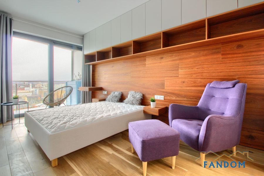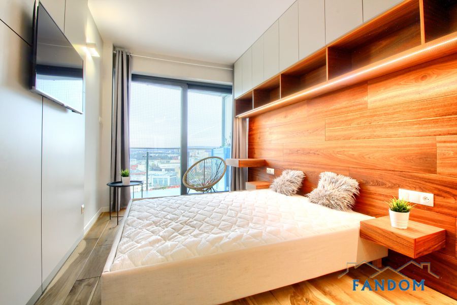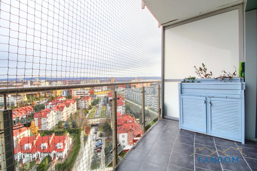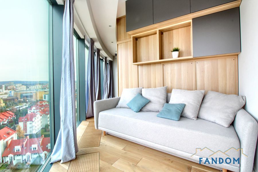 SZKLANE ŚCIANY w całym mieszkaniu. Piękny widok na miasto. Z salonu i sypialni wyjście na BALKON.