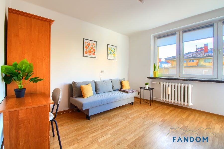Mniejszy pokój z rozkładaną kanapą, telewizorem i szafą. Z pokoju wyjście na balkon.