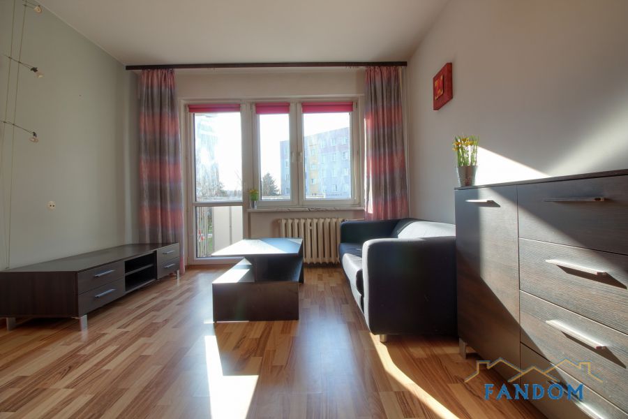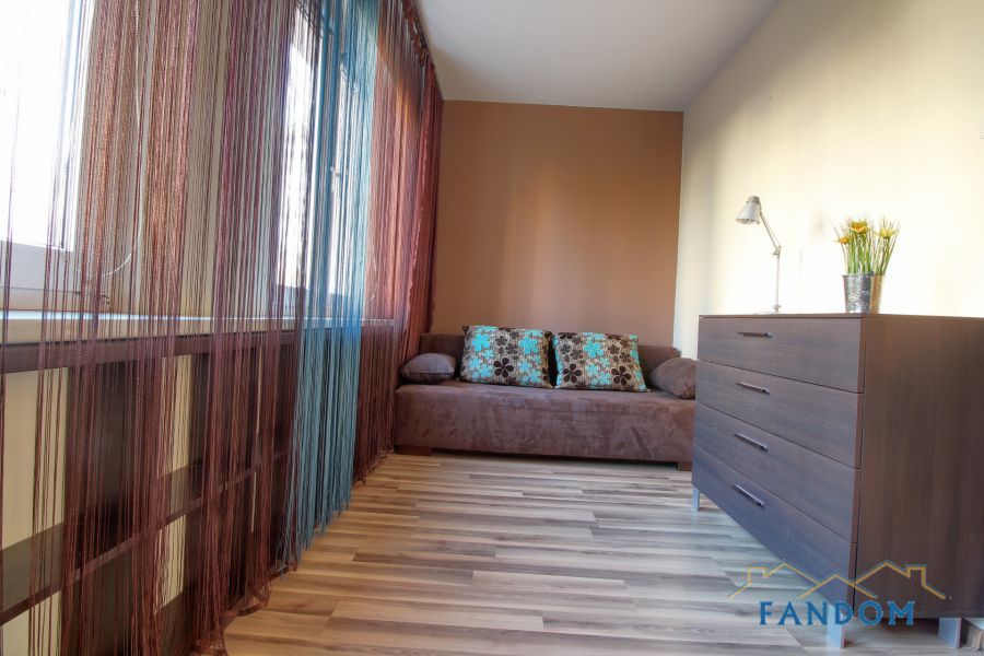 Duży pokój z balkonem. Całe mieszkanie wyposażone w markowe meble oraz kompletny sprzęt AGD.